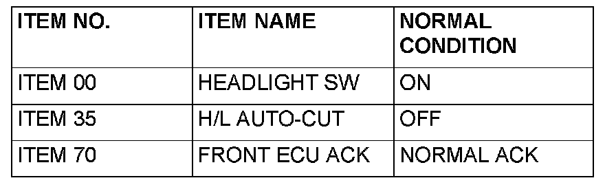 The scan tool does not show the respective normal condition for item "FRONT ECU ACK" : Normal condition is not displayed on the "FRONT ECU ACK": Replace the front-ECU. Verify that the headlights (low-beam) illuminate normally.