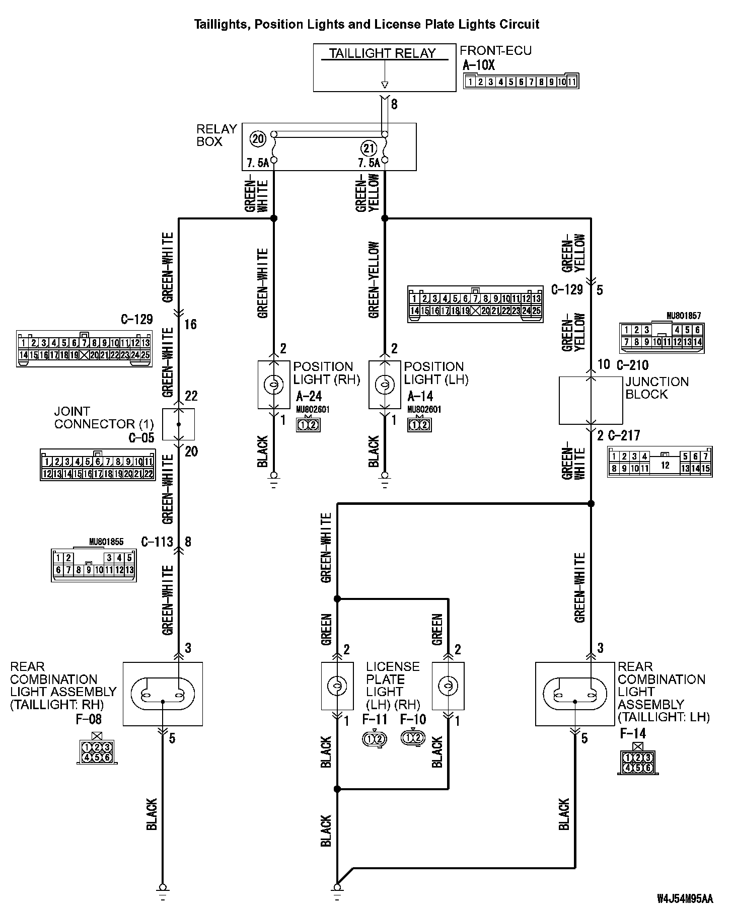 Headlight and Taillight: Any of taillights, the position lights or the license plate lights do not illuminate.Taillights, Position Lights And License Plate Lights Circuit Part 1: