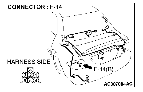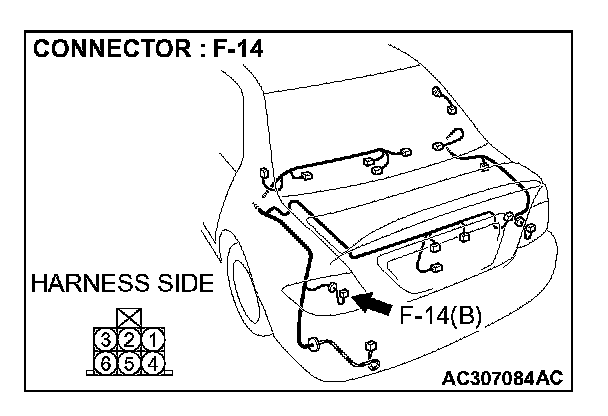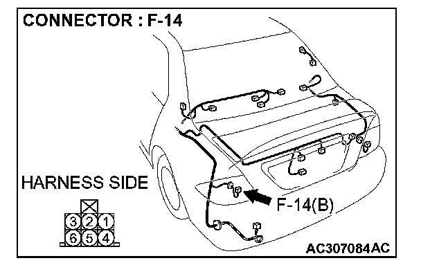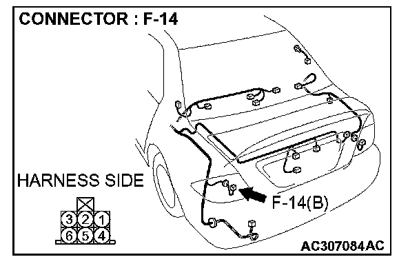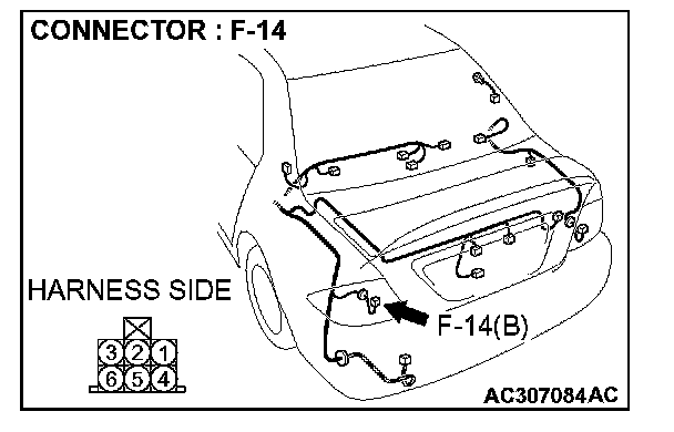 1. Disconnect rear combination light (LH) connector F-14 and measure the resistance available at the wiring harness side of the connector.