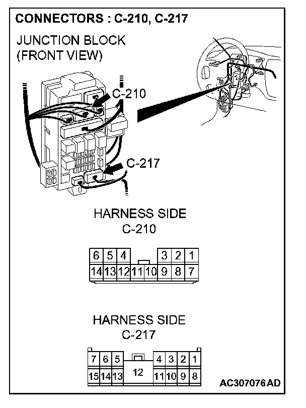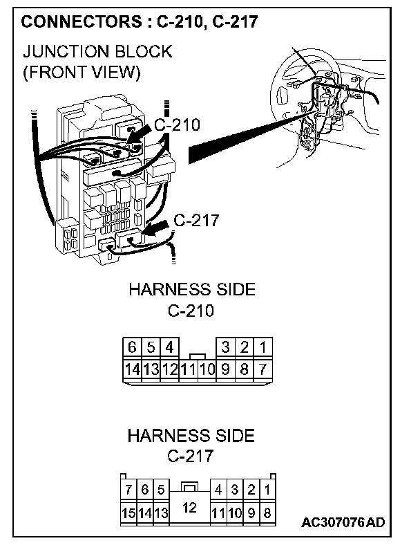NOTE: Also check junction block connectors C-210, C-217 and intermediate connector C-129 for loose, corroded, or damaged terminals, or terminals pushed back in the connector. If junction block connectors C-210, C-217 or intermediate connector C-129 is damaged, repair or replace the damaged component(s) as described in Harness Connector Inspection.