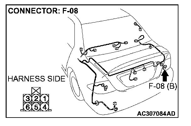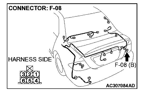 STEP 5. Check the wiring harness between rear combination light assembly (RH) connector F-08 (terminal 3) and front-ECU connector A-10X (terminal 8).