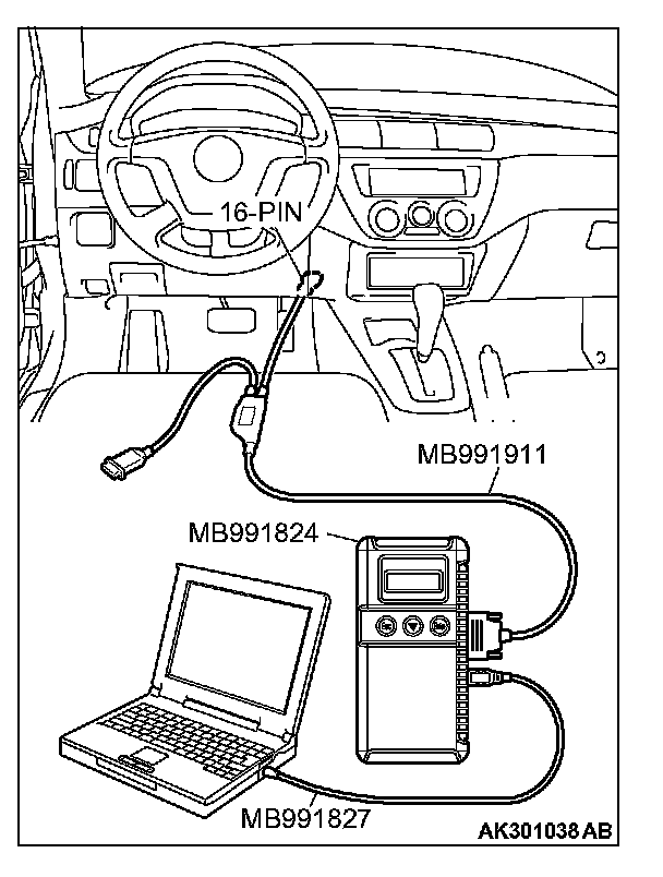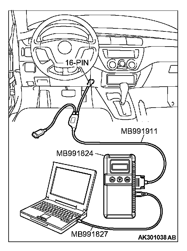 CAUTION: To prevent damage to scan tool MB991958, always turn the ignition switch to the "LOCK" (OFF) position before connecting or disconnecting scan tool MB991958.