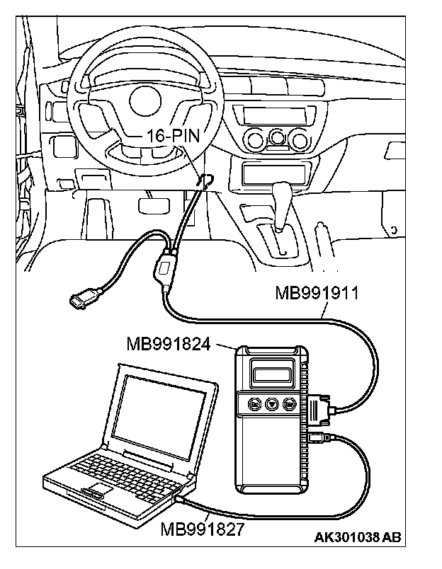 CAUTION: To prevent damage to scan tool MB991958, always turn the ignition switch to the "LOCK" (OFF) position before connecting or disconnecting scan tool MB991958.