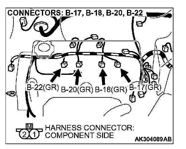 STEP 8. Check harness connectors B-22, B-20, B-18 and B-17 at injector for damage.