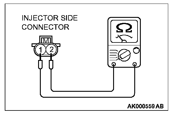 2. Measure the resistance between each injector side connector terminal No. 1 and No. 2.