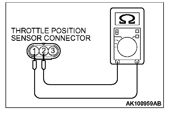 3. Measure resistance between the throttle position sensor side connector terminal No. 1 and terminal No. 2.