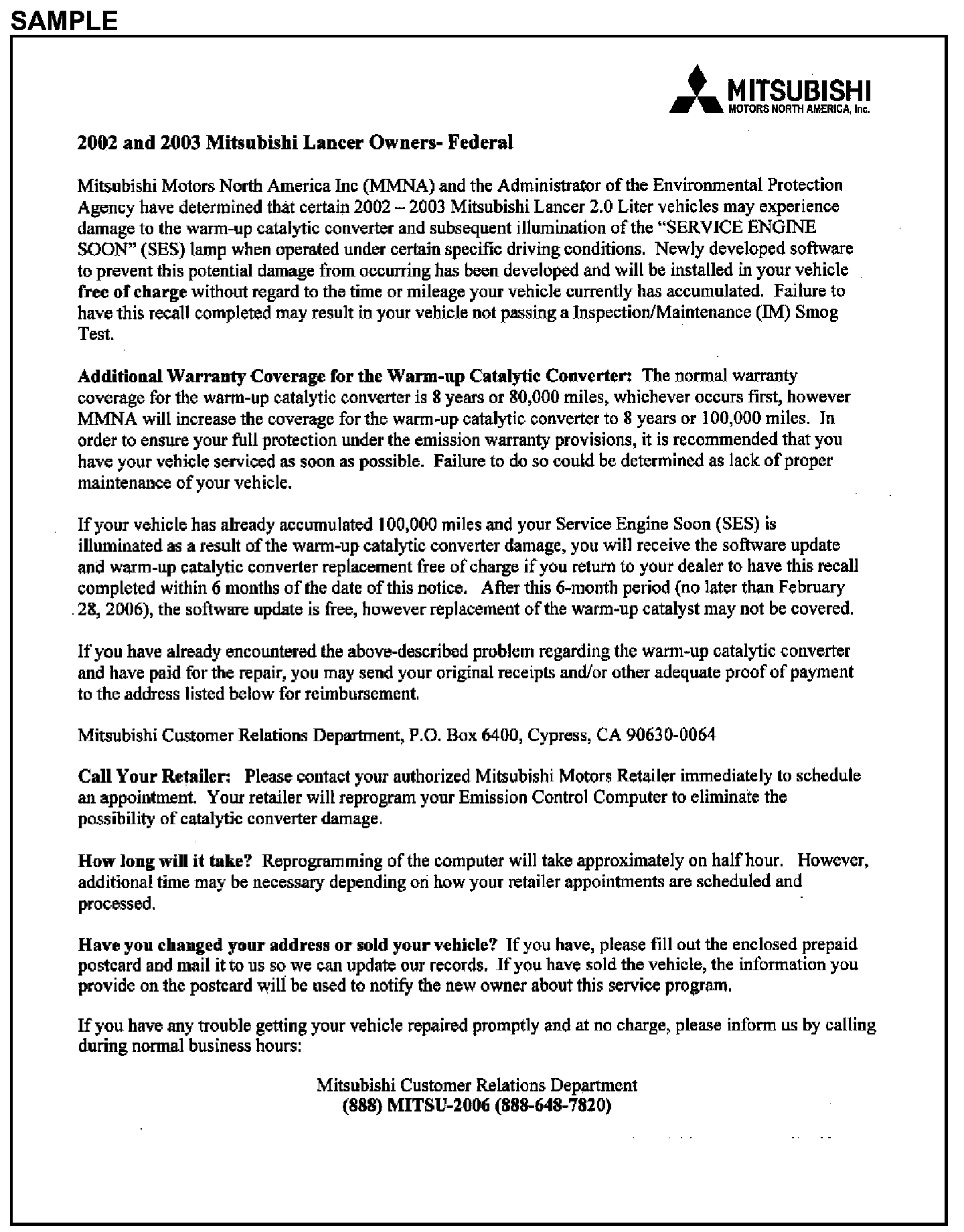 Owner Letter - 2002 & 2003 Mitsubishi Lancer Owners - Federal