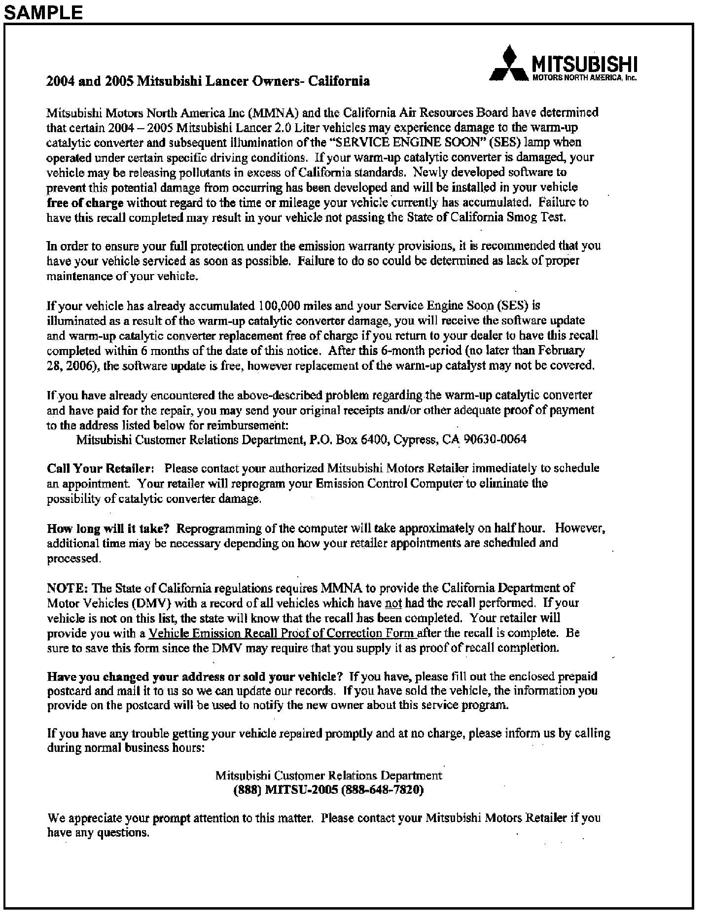 Owner Letter - 2004 & 2005 Mitsubishi Lancer - California
