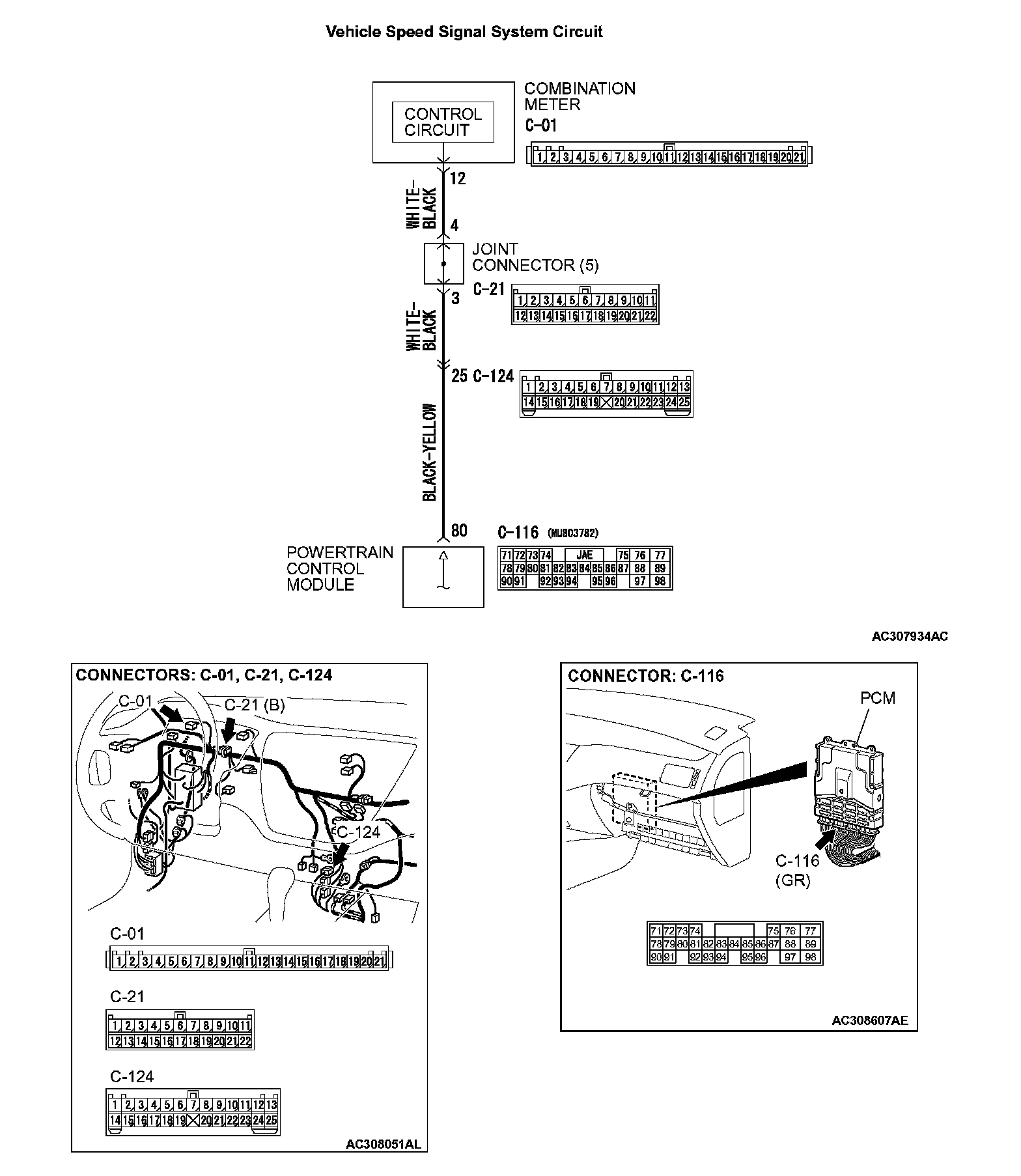 STEP 6. Check the harness for open circuit, short circuit to ground or damage between combination meter connector C-01 terminal 12 and PCM connector C-116 terminal 80.