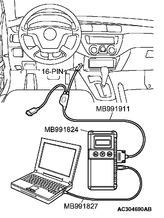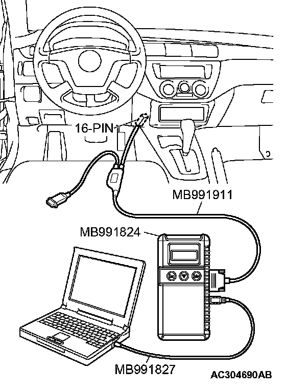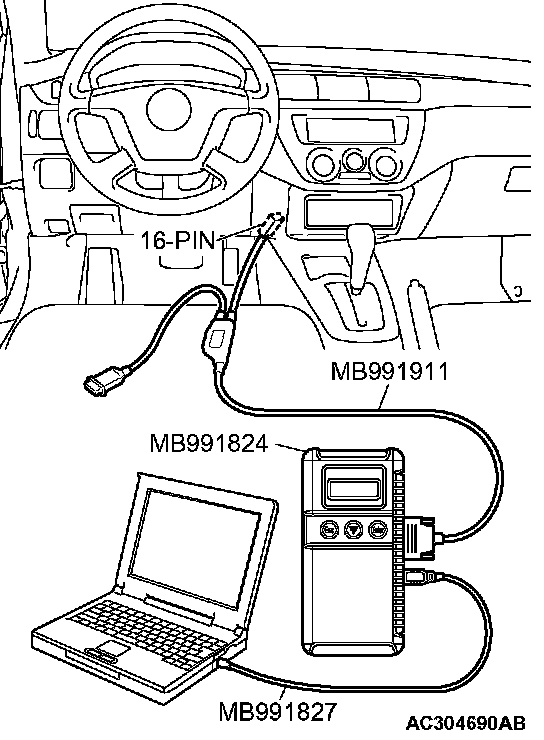 CAUTION: To prevent damage to scan tool MB991958, always turn the ignition switch to the "LOCK" (OFF) position before connecting or disconnecting scan tool MB991958.