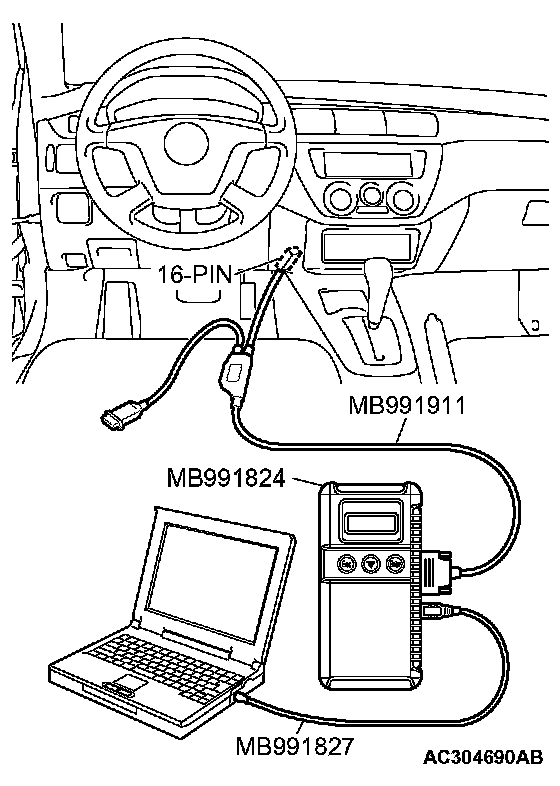 CAUTION: To prevent damage to scan tool MB991958, always turn the ignition switch to the "LOCK" (OFF) position before connecting or disconnecting scan tool MB991958.