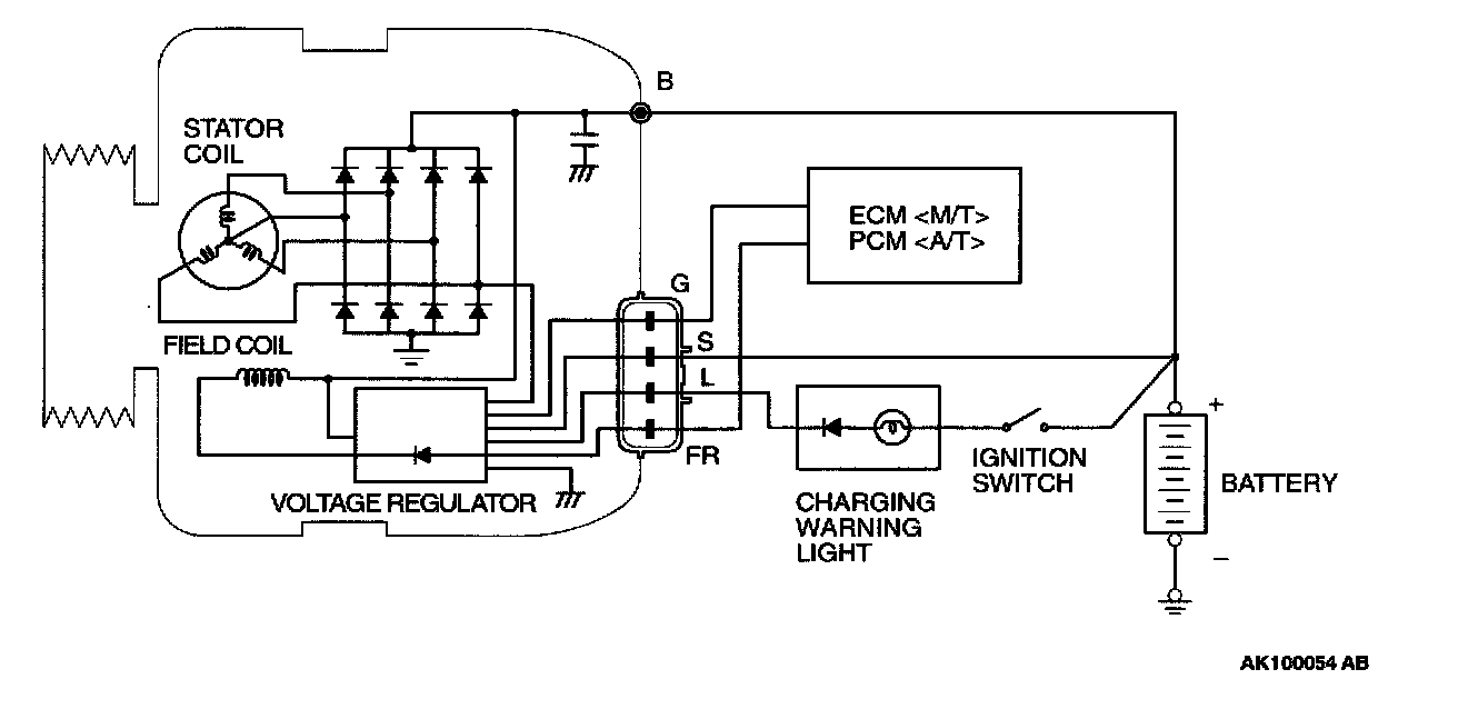 When the ignition switch is turned to the "ON" position, current flows in the field coil and initial excitation of the field coil occurs.