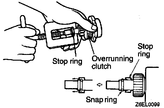 2. After removing the snap ring (by using snap-ring pliers), slide the stop ring and the overrunning clutch off the pinion shaft.