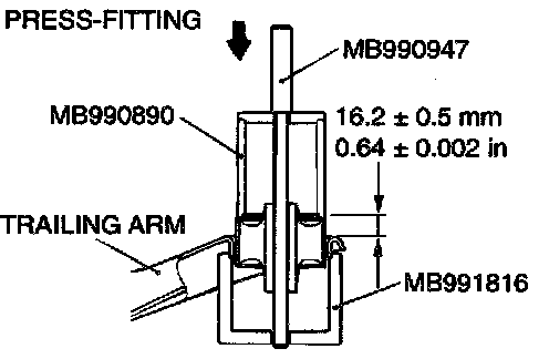 3. Using the special tool, press the trailing arm bushing into the position shown.