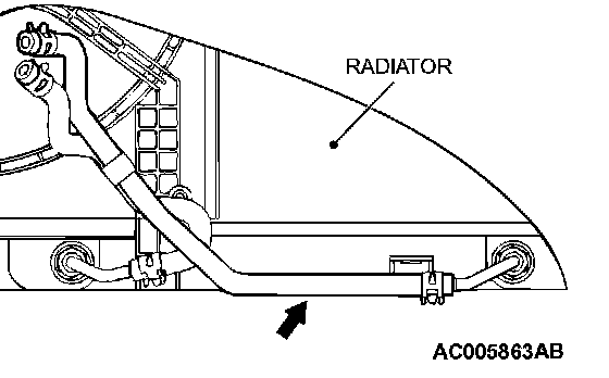 1. Disconnect the hose shown in the illustration which connects the transaxle and the oil cooler (inside the radiator). Place a container under the hose to collect the discharge.