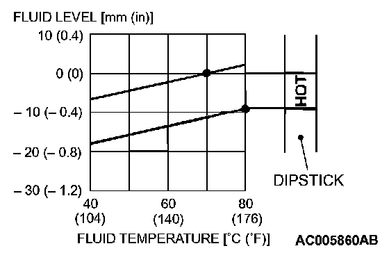 12. Drive the vehicle until the transmission fluid temperature rises to the normal operating temperature [70 - 80°C (158 - 176°F)], and then check the transmission fluid level again. The transmission fluid level must be at the "HOT" mark.