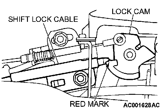 2. Fasten the shift lock cable at the position where the end of the shift lock cable is above the red line on the lock cam.