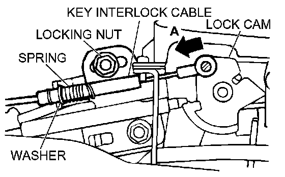 4. Lightly push the key interlock cable into the key interlock cable housing toward the arrow (A) direction until the cable movement stops and the cable end eye is aligned with the shaft on the lock cam. Tighten the lock nut. Snap the cable end eye onto the shaft of the lock cam.