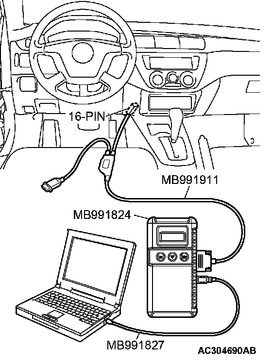 CAUTION: To prevent damage to scan tool MB991958, always turn the ignition switch to the "LOCK" (OFF) position before connecting or disconnecting scan tool MB991958.