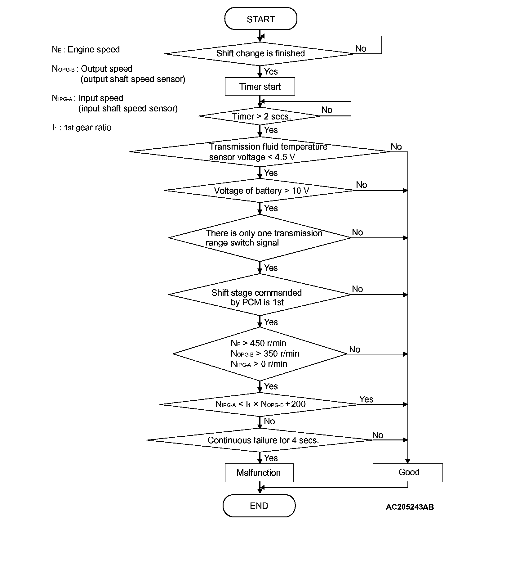 ^ In 1st gear, if a difference between turbine revolution and that value calculated from output revolution equals or exceeds specified value, PCM judges that step-out in 1st gear has occurred.