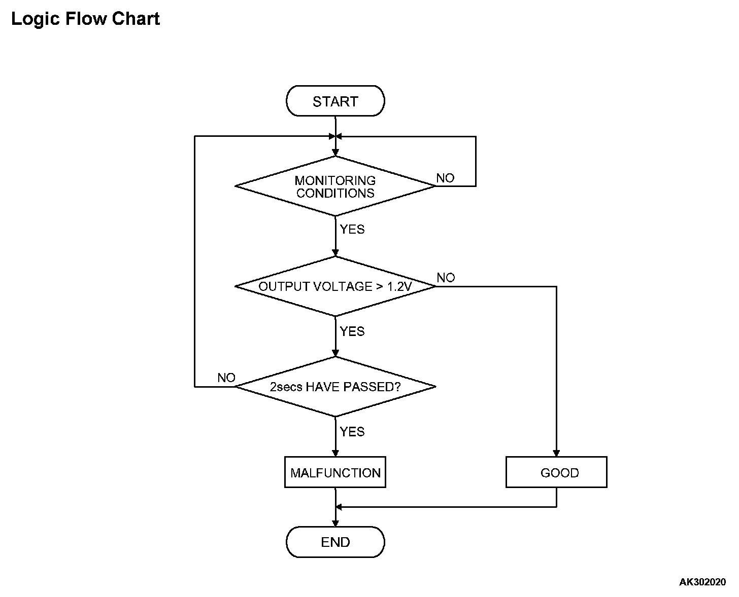 - Heated oxygen sensor (front) output voltage has continued to be 1.2 volts or higher for 2 seconds.