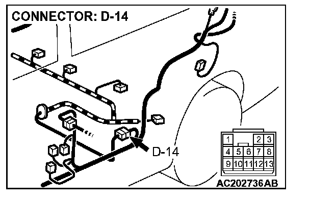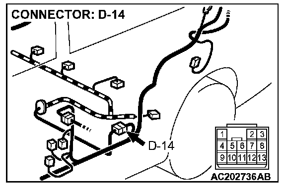 STEP 14. Check the harness wire between fuel tank differential pressure sensor connector D-09 terminal 2 and intermediate connector D-14 terminal 10 for damage.