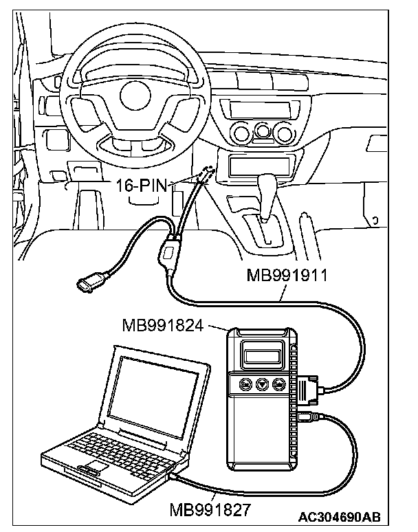 CAUTION: To prevent damage to scan tool MB991958, always turn the ignition switch to the "LOCK" (OFF) position before connecting or disconnecting scan tool MB991958.