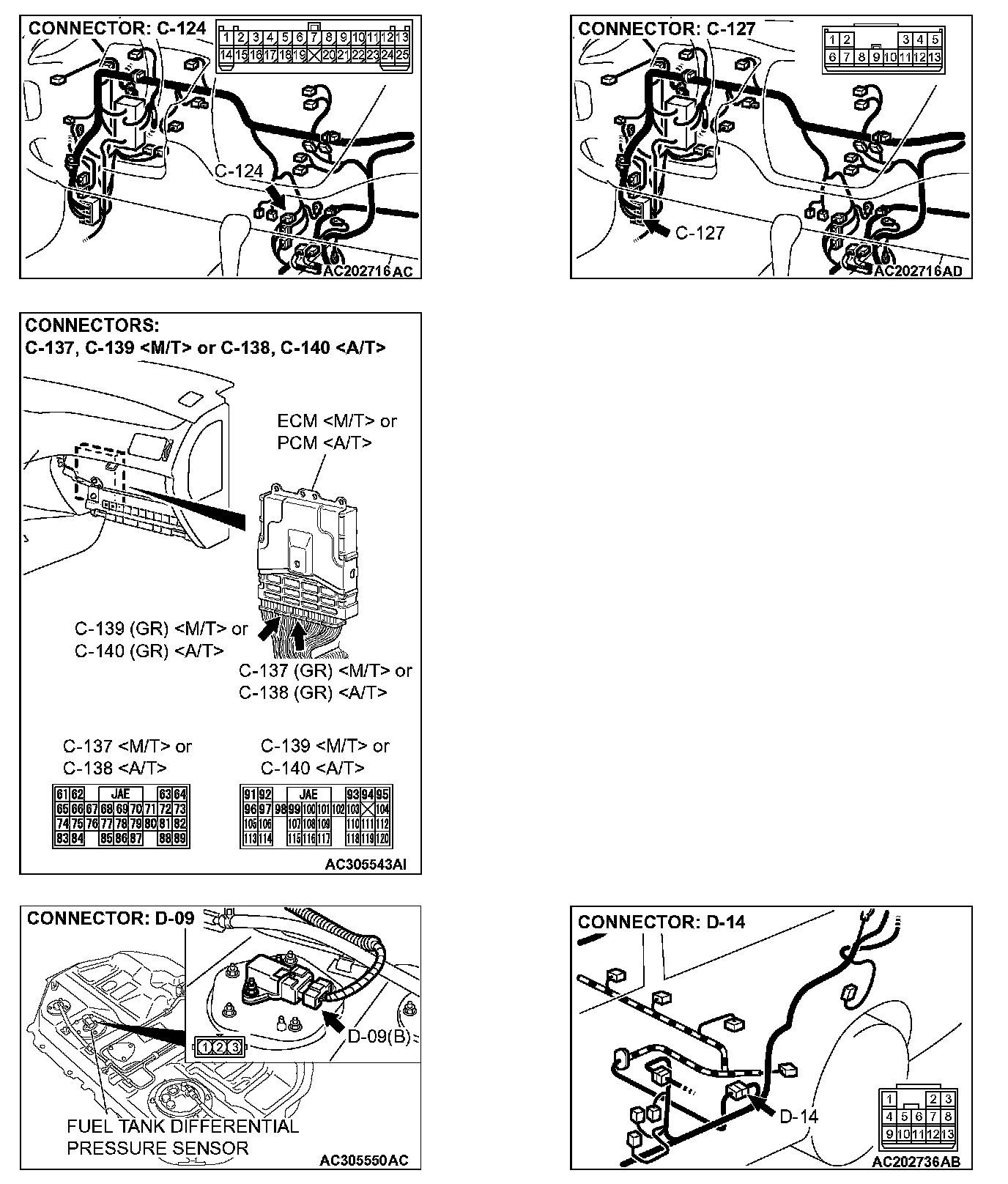 STEP 9. Check intermediate connectors C-105, C-124, C-127, and D-14 and ECM connector C-139