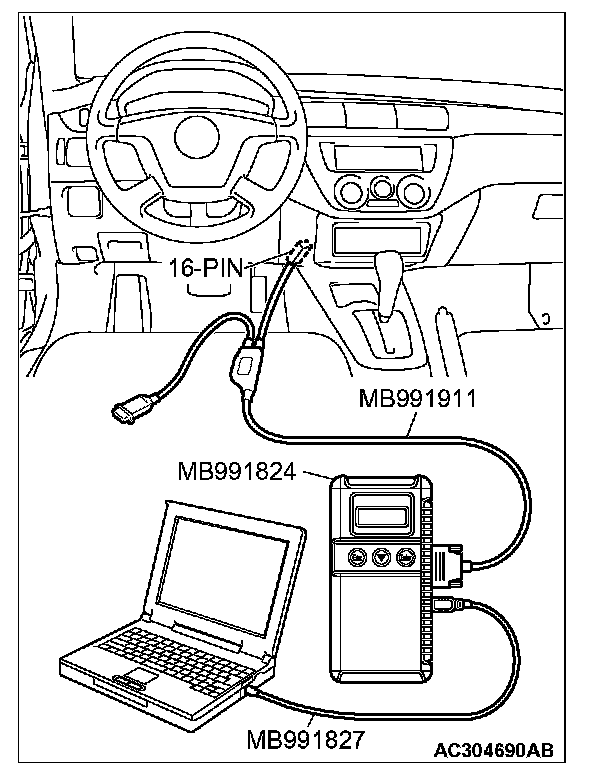 CAUTION: To prevent damage to scan tool MB991958, always turn the ignition switch to the "LOCK" (OFF) position before connecting or disconnecting scan tool MB991958.