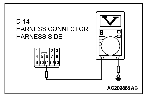 6. Measure the voltage between connector D-14 terminal 11 and ground by backprobing.