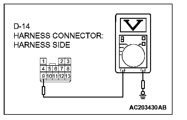 3. Measure the voltage between connector D-14 terminal 9 and ground.