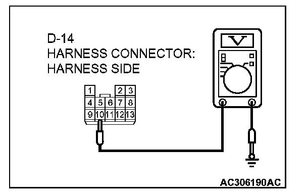 3. Measure the voltage between connector D-14 terminal 10 and ground by backprobing.