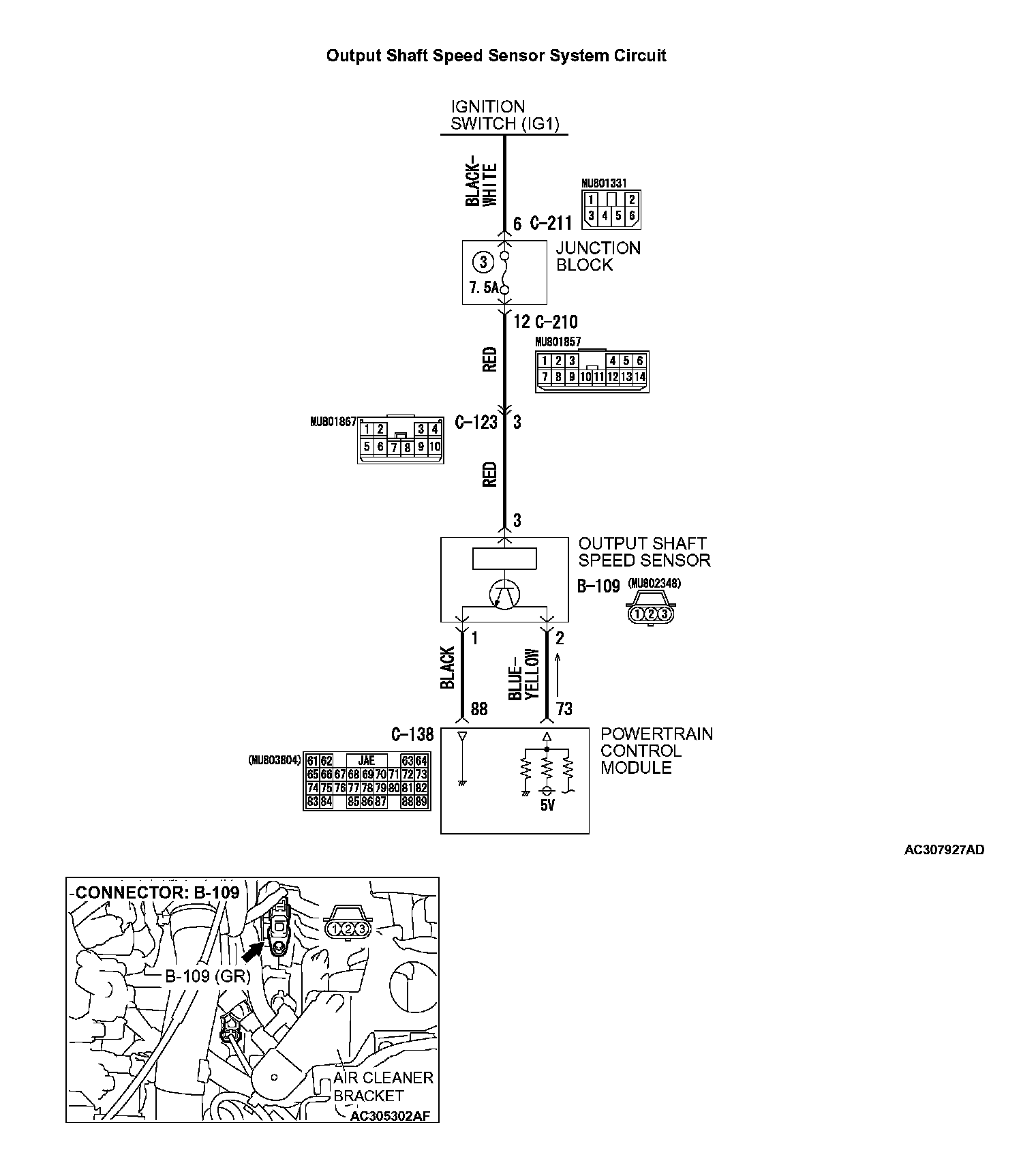 ^ The output shaft speed sensor is connected to the PCM (terminals 73 and 88) via the output shaft speed sensor connector (terminals 1 and 2).
