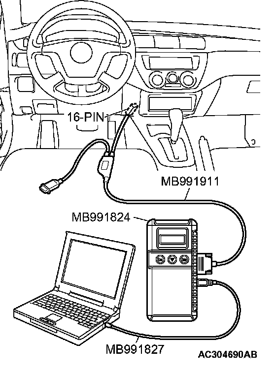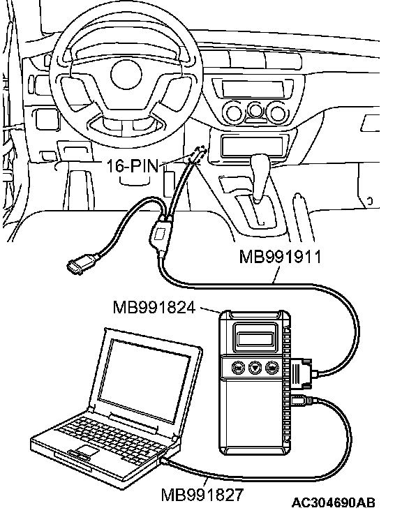 CAUTION: To prevent damage to scan tool MB991958, always turn the ignition switch to the "LOCK" (OFF) position before connecting or disconnecting scan tool MB991958.