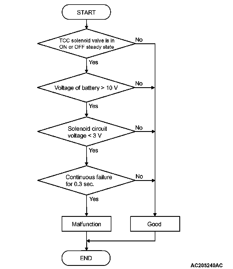 ^ If lock-up is not engaged, and solenoid terminal voltage is below specified value, PCM judges that torque converter clutch solenoid valve has a failure.