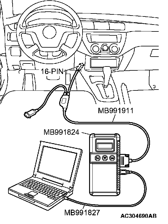 CAUTION: To prevent damage to scan tool MB991958, always turn the ignition switch to the "LOCK" (OFF) position before connecting or disconnecting scan tool MB991958.