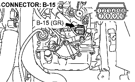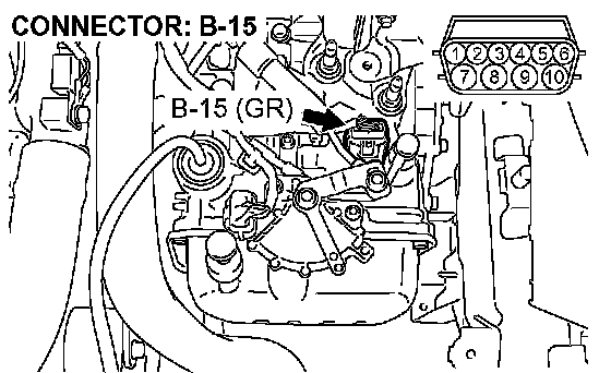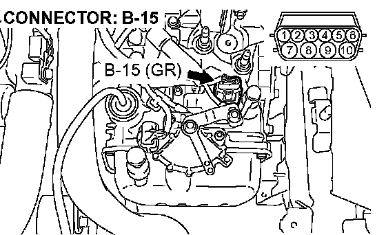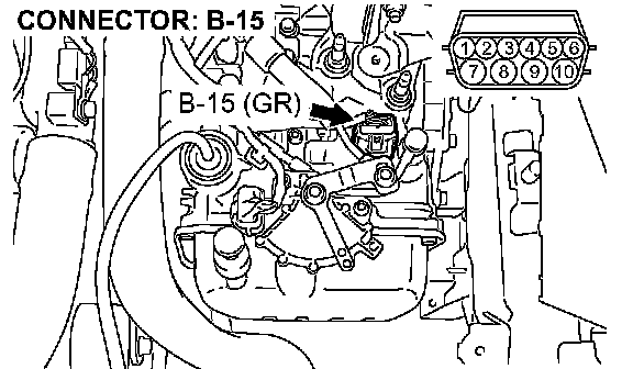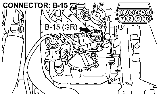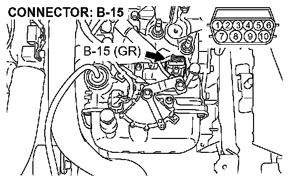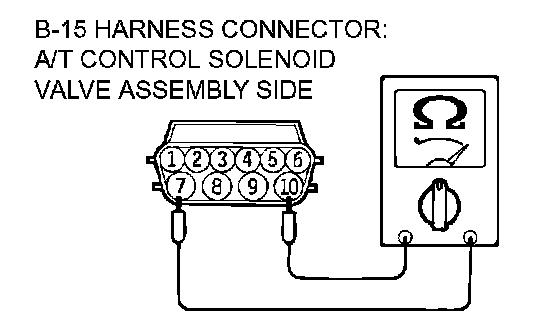 STEP 13. Check the harness for an open or short circuit to ground between A/T control solenoid valve assembly connector B-15 (terminals 6, 7, and 10) and solenoid valve connectors B-15-4 and B-15-5.