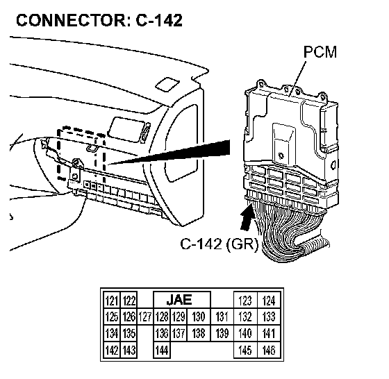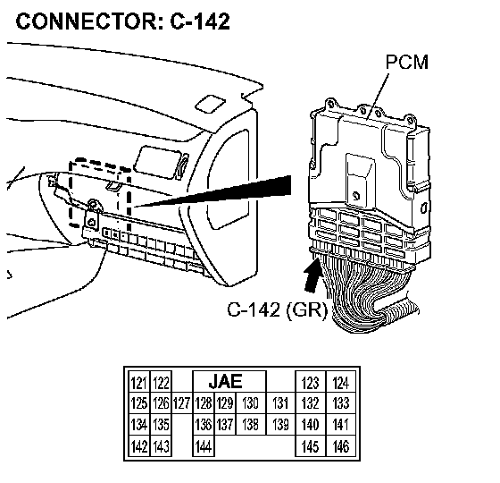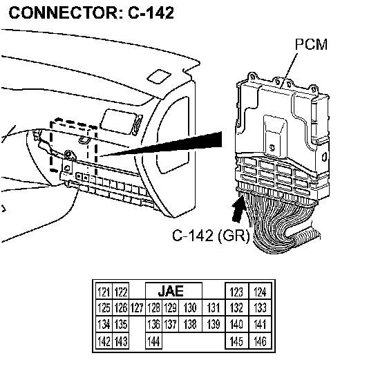 STEP 11. Check A/T control solenoid valve assembly connector B-15 and PCM connector C-142 for loose, corroded or damaged terminals, or terminals pushed back in the connector.