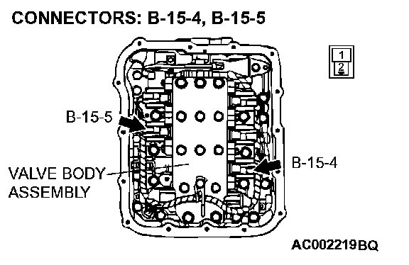 STEP 6. Check A/T control solenoid valve assembly connector B-15 and PCM connector C-142 for loose, corroded or damaged terminals, or terminals pushed back in the connector.