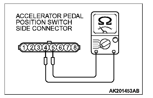 2. Check the continuity between accelerator pedal position switch side connector terminal No. 4 and No. 5.