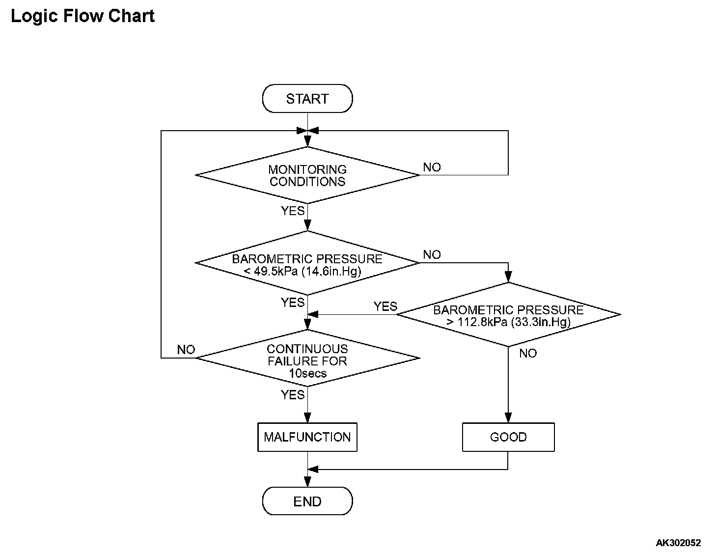 - Barometric pressure sensor output signal has continued to be 112.8 kPa (33.3 in.Hg) or higher (approximately 4,000 ft below sea level) for 10 seconds.