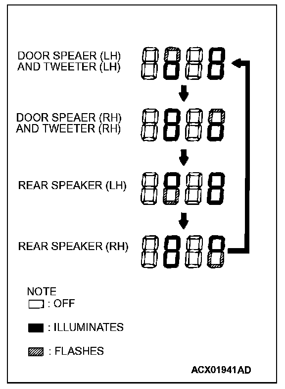 4. If a button other than the memory select "6" button and "EJECT" button is pressed, or the ignition switch is turned to "LOCK" (OFF) position, you will exit from the speaker test mode.
