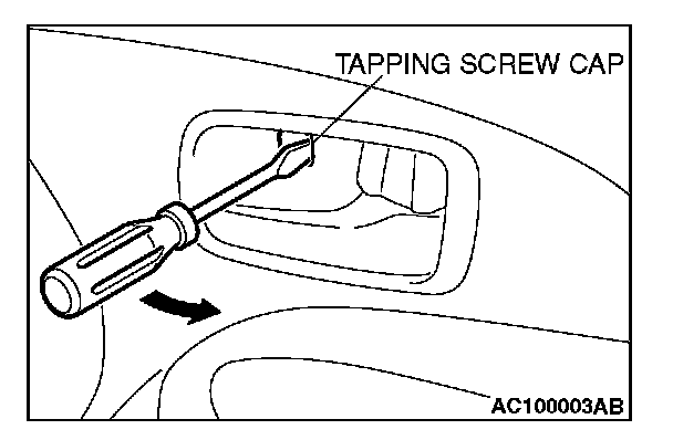 1. Insert a flat-tipped screwdriver into the rear end of the tapping screw cap on the door inside handle cover, and prize out the cap to the direction shown. Then remove the tapping screw.