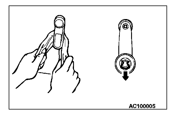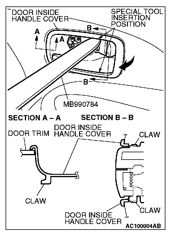 2. Insert special tool MB990784 into the clearance between the door inside handle cover and the door inside handle, and disengage the claws of the door inside handle.