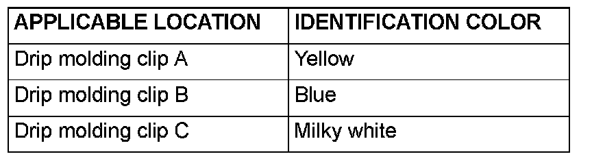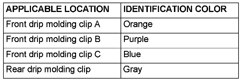 The front drip molding clips A, B, C and rear drip molding clip differ according to where they are used, so check the identification color before installation.