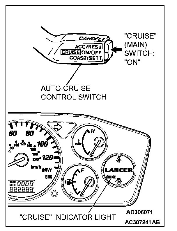 2. Check that the "CRUISE" indicator light within the combination meter illuminates when the "CRUISE" (MAIN) switch is switched "ON".