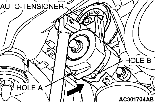 2. Rotate the auto-tensioner counterclockwise and align hole A with hole B.
