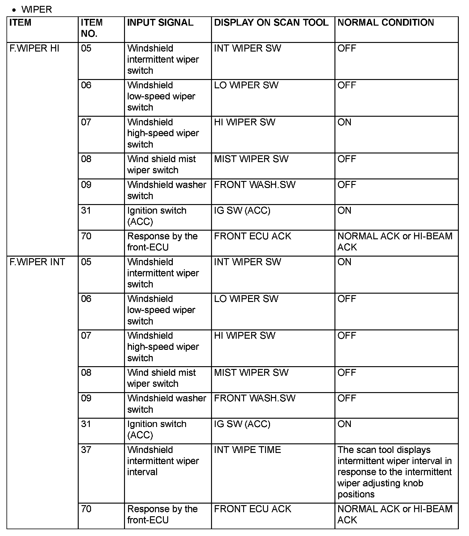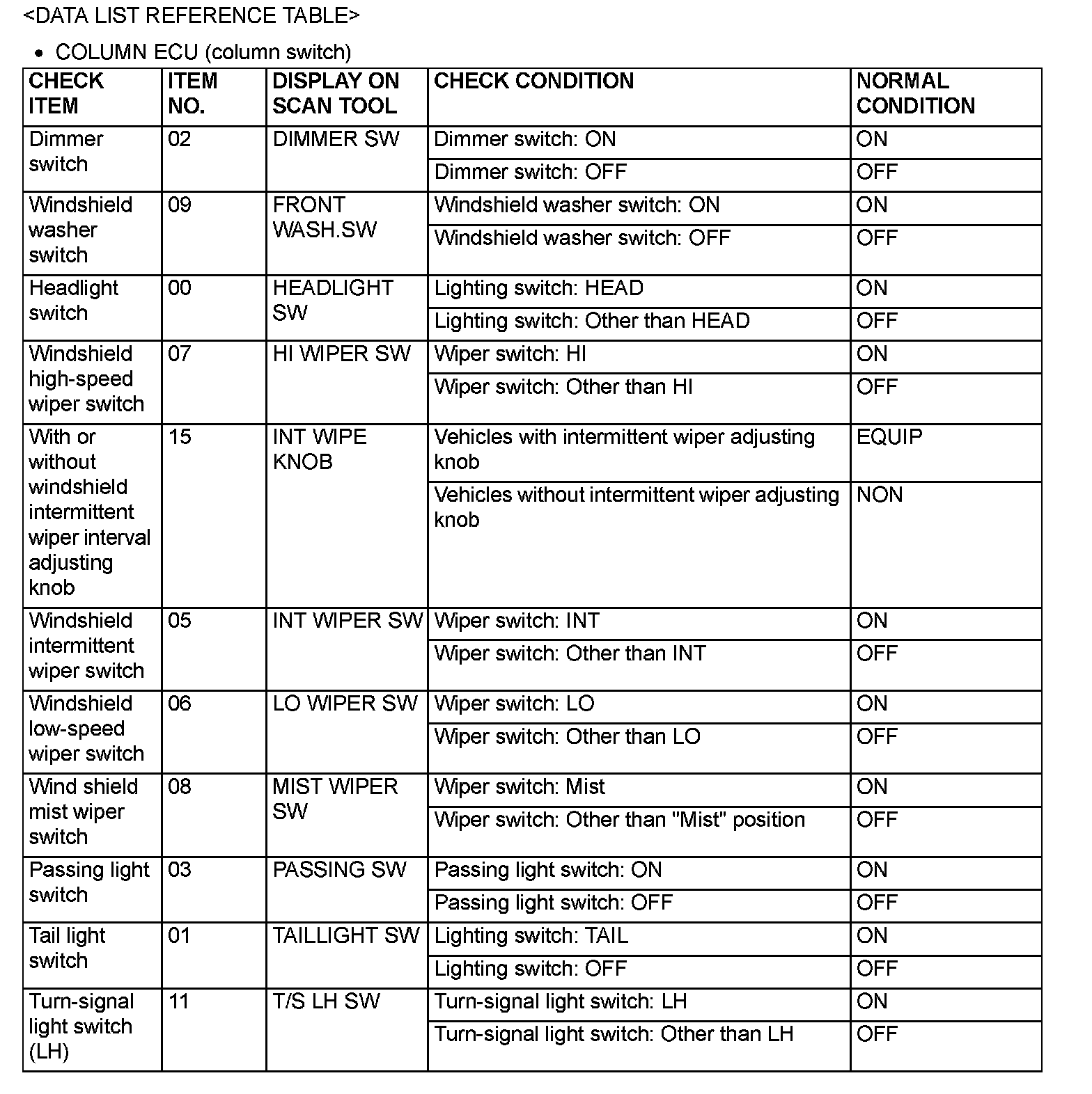 For checking item "HI (High-beam)", the scan tool displays "OFF" on the item number 2 "Dimmer SW" when the headlights are at high-beam. Therefore, the scan tool should display "ON" momentarily when the dimmer switch is operated.