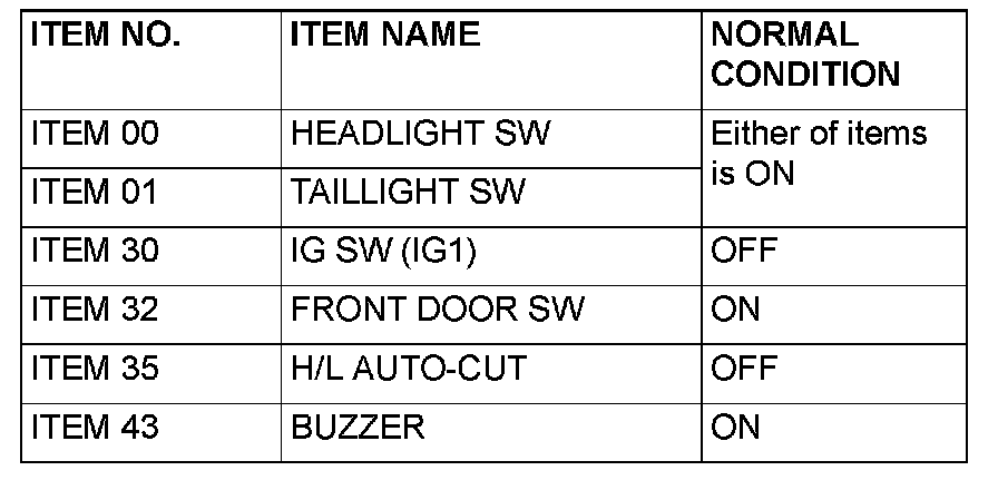 Q: Are normal conditions displayed for "HEADLIGHT SW", "TAILLIGHT SW", "IG SW (IG1)", "FRONT DOOR SW", "H/L AUTO-CUT" and "BUZZER"?