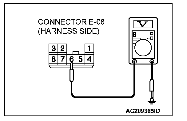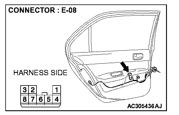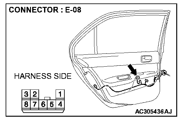 1. Disconnect power window sub-switch (rear: LH) connector E-08 and measure the voltage available at the wiring harness side of the connector.